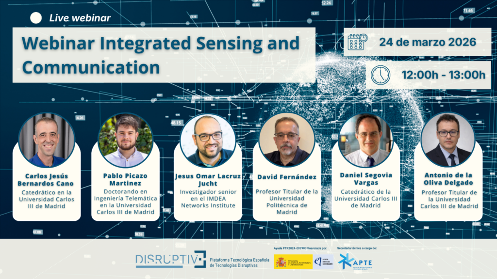 PTE Disruptive abordará qué es Integrated Sensing and Communication (ISAC) y por qué se perfila como una tecnología clave en el desarrollo de 6G. Además, se explorará cómo se está aplicando actualmente en entornos como WiFi y 3GPP, qué arquitecturas se están proponiendo desde el ámbito investigador y cuál es el estado del arte en esta tecnología. Se contará con la participación de expertos de la Universidad Carlos III de Madrid, la Universidad Politécnica de Madrid y IMDEA Networks Institute, que compartirán su conocimiento y las últimas líneas de investigación en este ámbito.