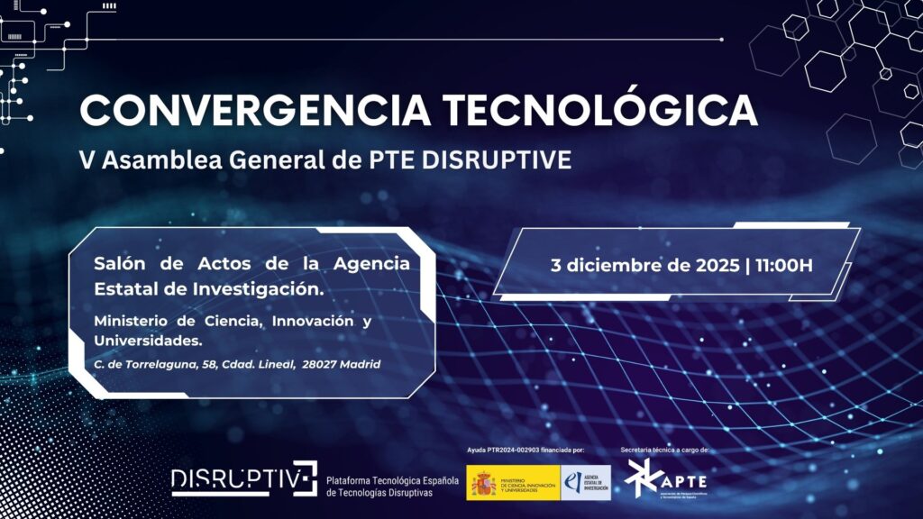 El próximo miércoles 3 de diciembre de 2025, el Salón de Actos de la Agencia Estatal de Investigación (Ministerio de Ciencia, Innovación y Universidades, Madrid) acogerá la V Asamblea General de PTE Disruptive, un encuentro clave para explorar la convergencia de tecnologías disruptivas y su impacto en la innovación empresarial y científica.