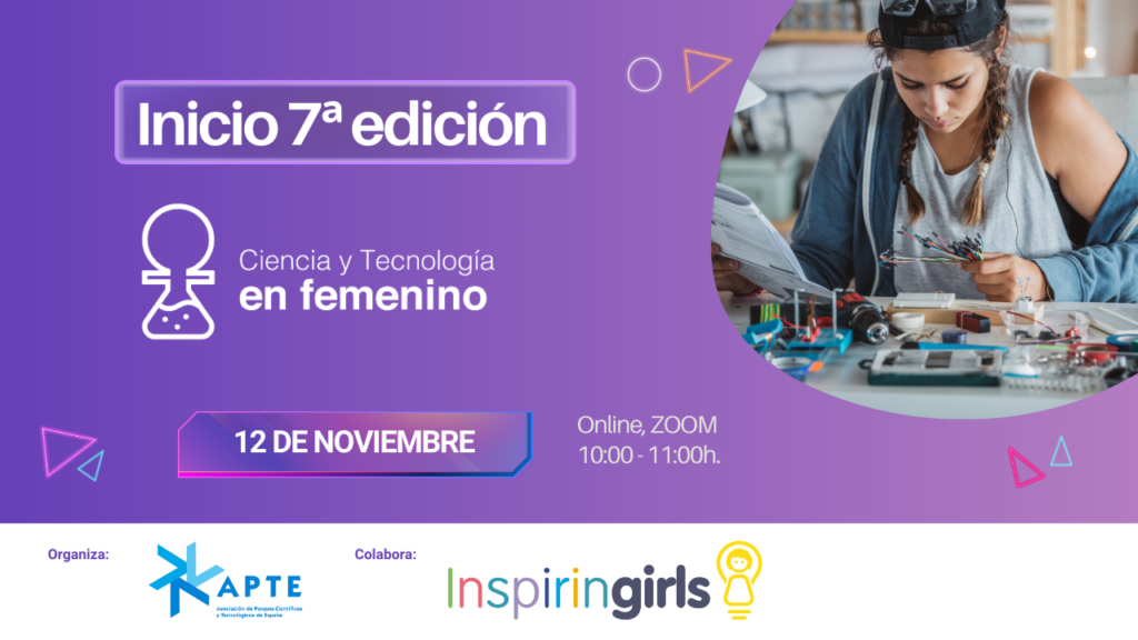 La 7.ª edición de Ciencia y Tecnología en Femenino comenzará el 12 de noviembre con un evento online en colaboración con Inspiring Girls. Durante la sesión se presentará la alianza entre la Asociación de Parques Científicos y Tecnológicos de España (APTE) y la iniciativa Inspiring Girls, cuyo objetivo es fomentar la ambición profesional de las niñas y elevar sus expectativas laborales, especialmente en sectores con menor presencia femenina, como los STEAM.