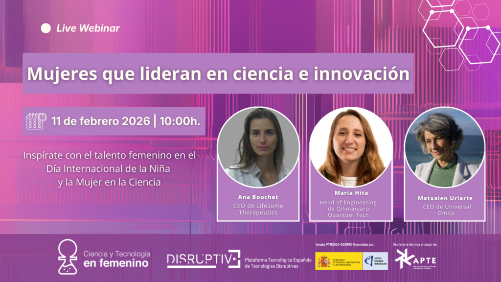 PTE Disruptive organiza el primer webinar de 2026 junto a Ciencia y Tecnología en Femenino, centrado en dar voz a mujeres que lideran en ciencia e innovación. Esta iniciativa se enmarca en la conmemoración del Día Internacional de la Mujer y la Niña en la Ciencia y tiene como objetivo poner en valor el papel clave de las mujeres en el emprendimiento científico y tecnológico, así como promover las vocaciones STEM.